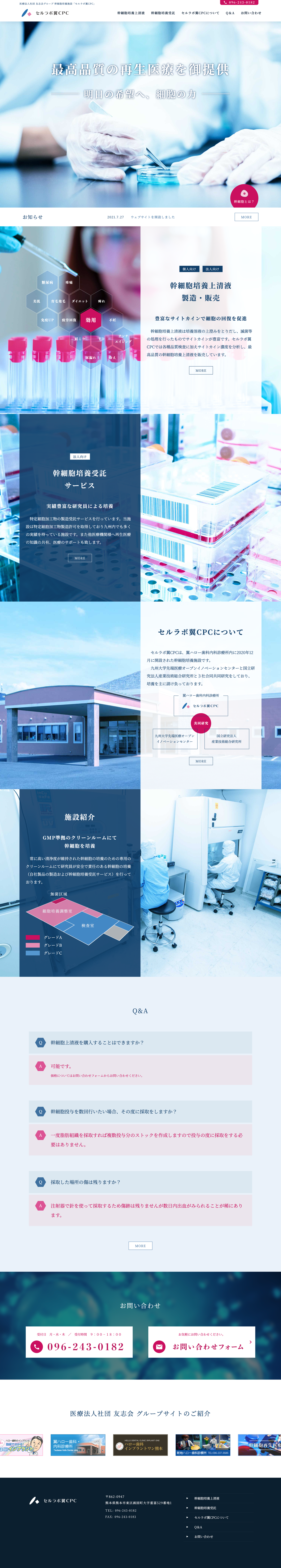 細胞加工施設「セルラボ翼CPC」のコーポレートサイトを制作。品格が求められる業種に合わせ、明朝体を基調としたきっちりとした雰囲気に仕上げました。写真をレタッチしてロゴカラーのシアンとマゼンタに統一し、サイト全体に一貫したブランドイメージを構築しています。