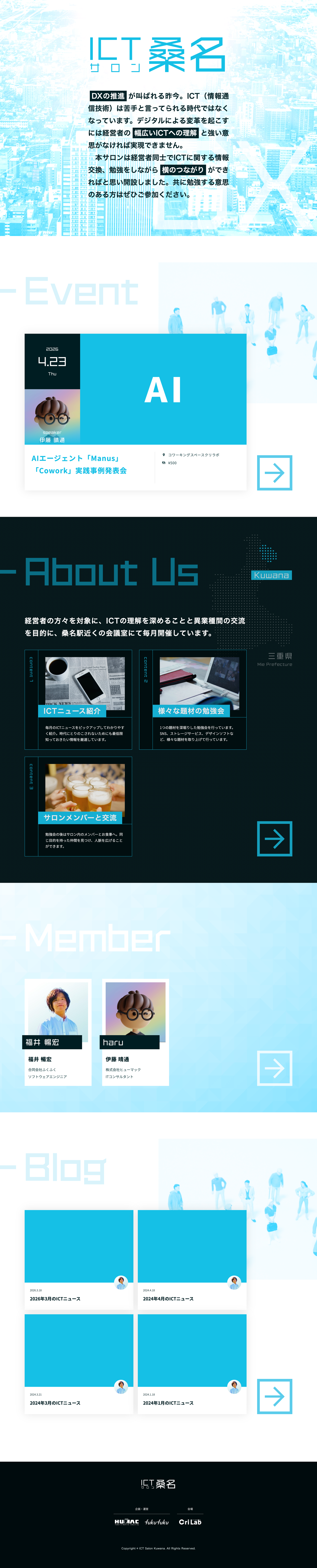 三重県桑名市のICTコミュニティ「ICTサロン桑名」のWebサイトを制作。イベントへの参加申込みがあるとLINE公式アカウントを通じて運営関係者に自動通知が届く仕組みを構築。参加者がメンバーとして加入でき、イベントページには参加者のアバターが表示される機能も実装しています。