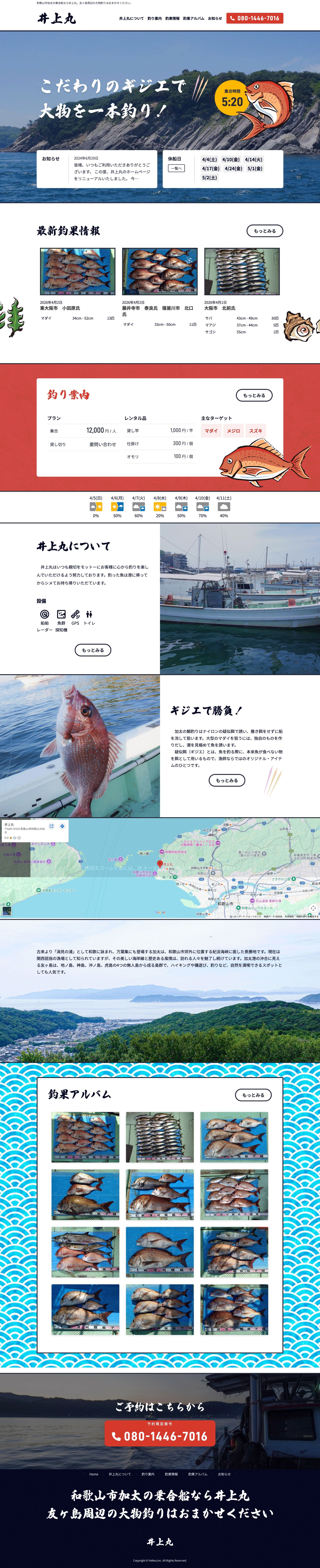 乗合船「井上丸」のWebサイトを制作。予約の問い合わせを増やすことを目的に、電話CTAを目立つ位置に強調表示しました。釣果ギャラリーや天気情報など、釣り人が知りたい情報をまとめて確認できるサイトに仕上げました。フリー素材のイラストを活用し、魚釣りの雰囲気を演出しています。