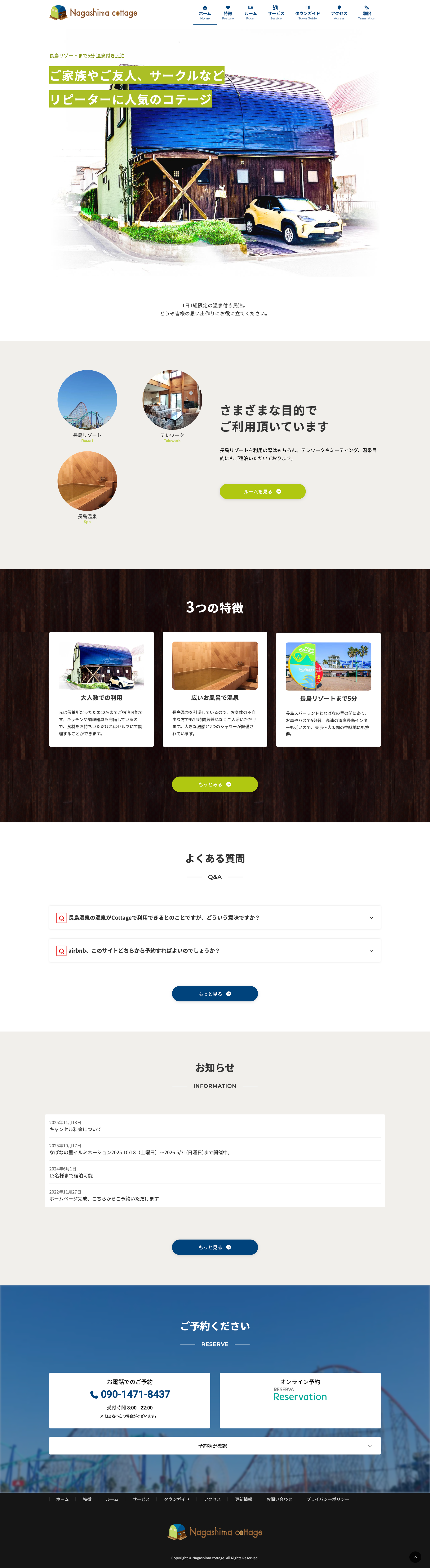 長島リゾート近くの一棟貸しコテージ「長島コテージ」のWebサイトを制作。海外からの旅行客を呼び込むためにGoogle翻訳機能を導入し、多言語での閲覧に対応しました。Googleカレンダーを埋め込み、予約状況をリアルタイムで確認できる仕組みも実装しています。