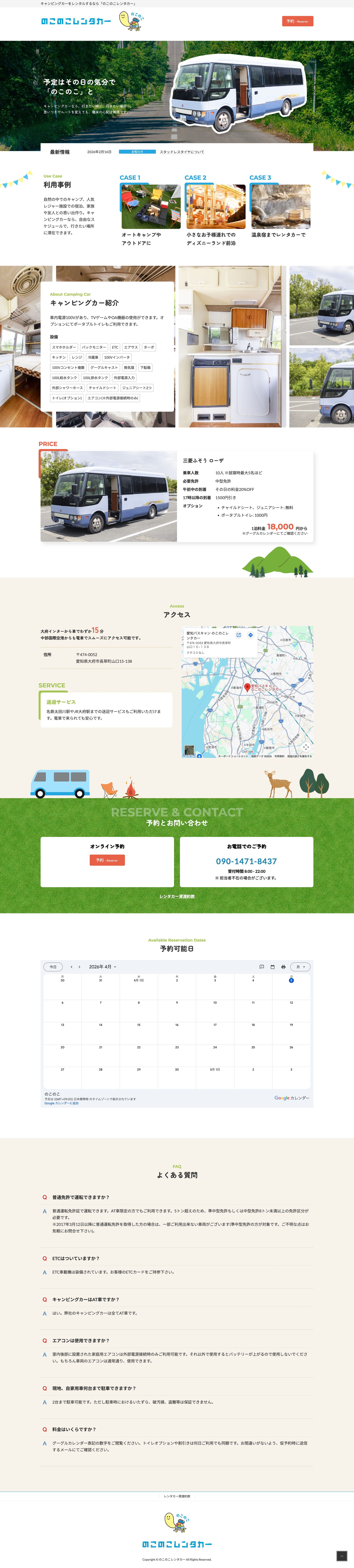 レンタカー店「のこのこレンタカー」のWebサイトを制作。低予算に対応するため、1ページに料金・車種・アクセスなど必要な情報をすべて集約したシンプルな構成にしました。キャンプや自然のイラストを使い、レンタカーでお出かけする楽しさを演出。ロゴのカラーテーマに合わせた統一感のある色使いに仕上げています。