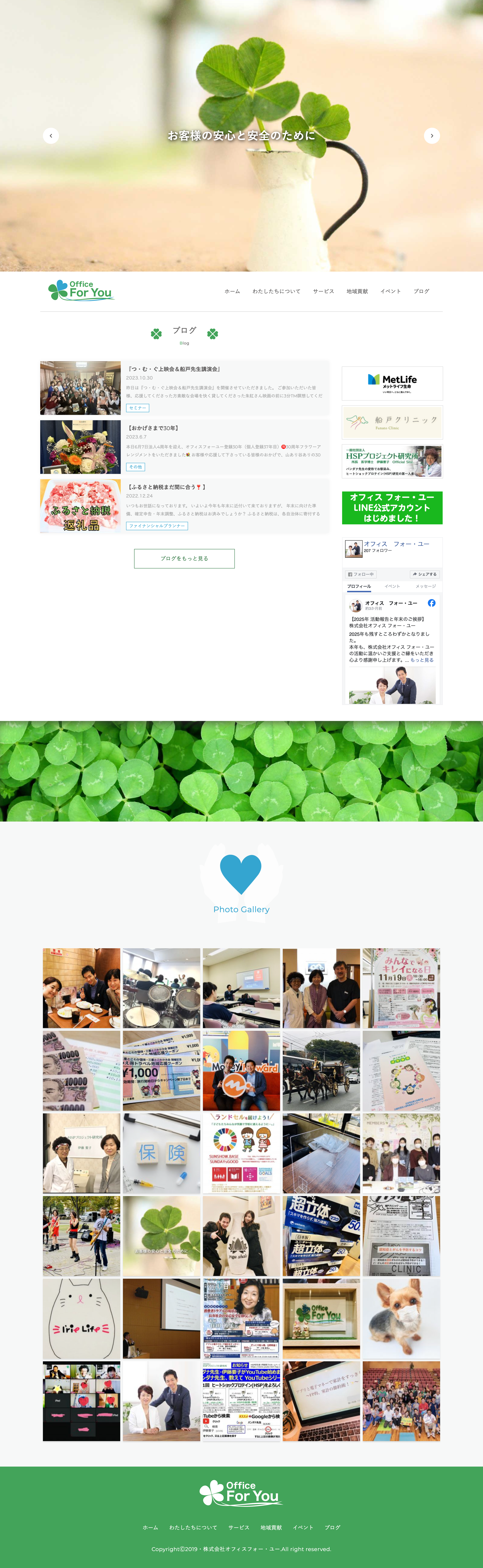 保険業を営む株式会社オフィスフォー・ユーのコーポレートサイトを制作。保険業は人の信頼が重要になるため、活動の様子が一目でわかるフォトギャラリーをトップに配置しました。ブログの写真がギャラリービューで表示される仕組みにより、日々の活動を写真で伝えています。ロゴのクローバーをモチーフにした装飾でブランドイメージを統一しました。
