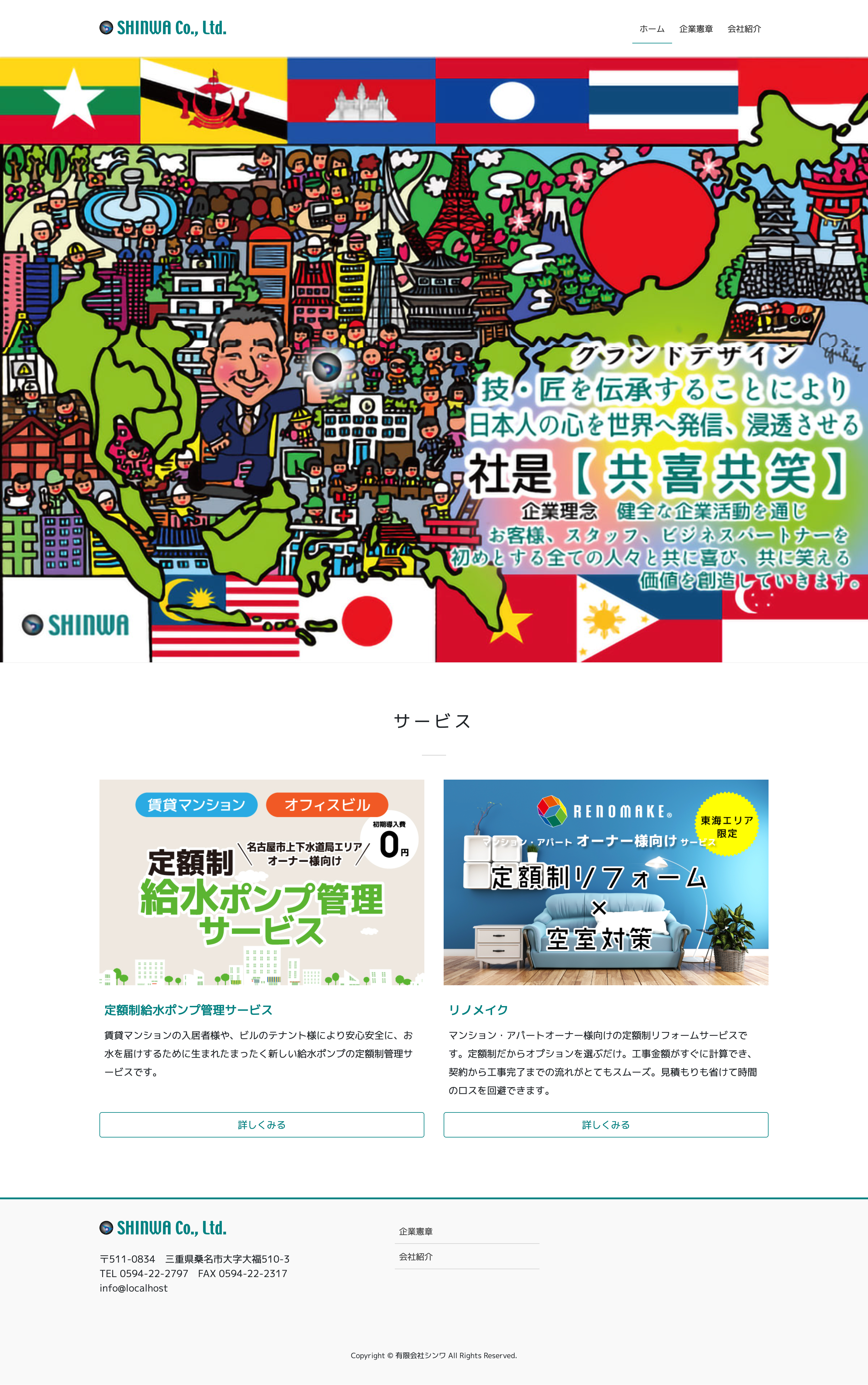 有限会社シンワのコーポレートサイトとLP2件を制作。低予算に対応するためLightningテーマを活用し、テーマの標準機能を最大限に使って情報を整理しました。LPはデザイナーが作成した複雑なデザインを画像化せずにコードで表現し、SEOにも配慮した実装を行っています。